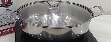 Sản phẩm tặng kèm 1 chảo lẩu inox với quai đũa chắc chắn, nắp kính cường lực trong suốt dễ dàng quan sát thức ăn bên trong