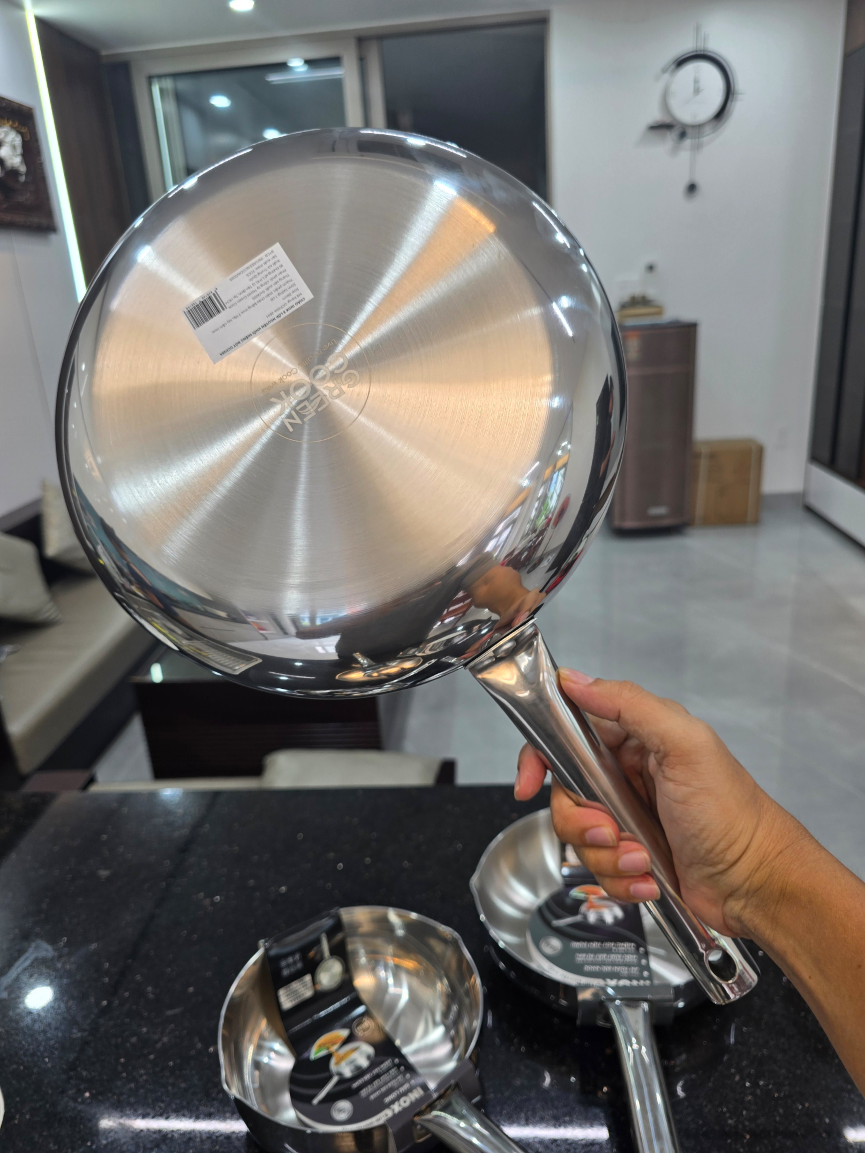 - Thiết kế chảo: inox 3 lớp đúc nguyên khối, không phải dập ép