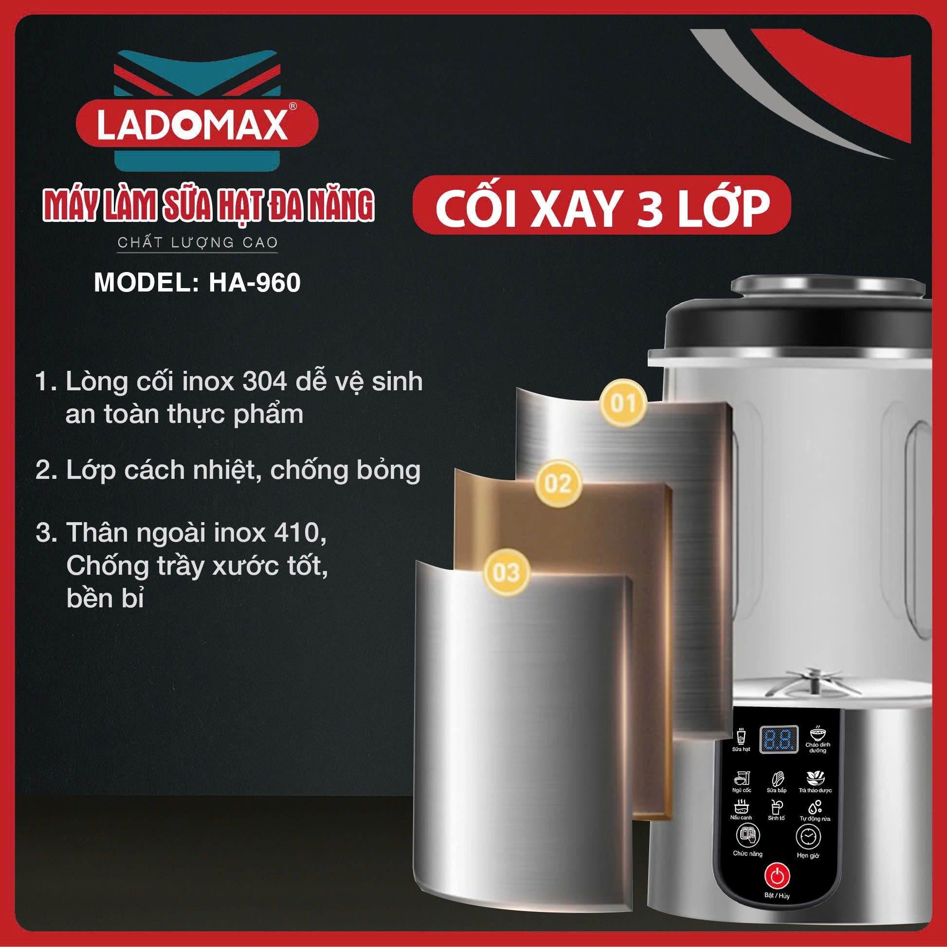 Máy làm sữa hạt LADOMAX HA-960 là dòng sản phẩm điện tử cao cấp, thiết kế sang trọng, tích hợp nhiều công nghệ hiện đại giúp việc nấu sữa – nấu ăn trở nên nhanh gọn, an toàn và tiết kiệm thời gian cho gia đình.